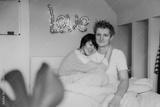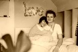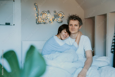 Loving couple in pajamas having fun in bed in the bedroom with word Love on the wall background. They are embracing and laughing. Happy family mornings at home. Valentine's day. Selective focus.