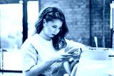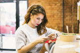 Concentrated Woman looking on her smartphone while having lunch in the cafe. Remote work, social networks scrolling, chatting or making notes.