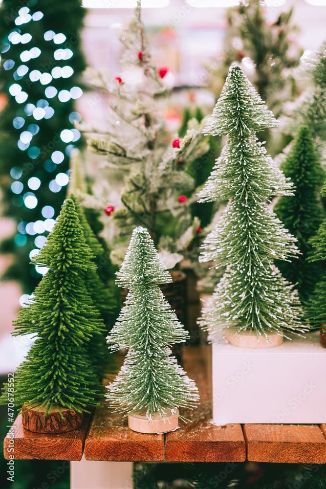 Christmas and New Year's decorative artificial trees on the counter in the store on the Christmas market. Preparing for winter holidays. Vertical card. Selective focus.