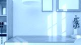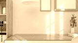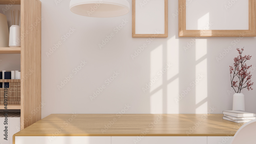 Close-up Cozy Scandinavian wooden working desk and blank poster frame on white wall.