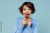 Young smiling happy woman in casual sweater hold sweet pink cream donuts biting chocolate bar look camera isolated on plain pastel light blue background studio portrait. People lifestyle food concept.