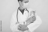 caucasian male veterinarian with a stethoscope looking at a cat held in his arms