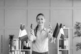 Learn foreign languages. Happy female teacher holding bunches of international flags, smiling to camera in office