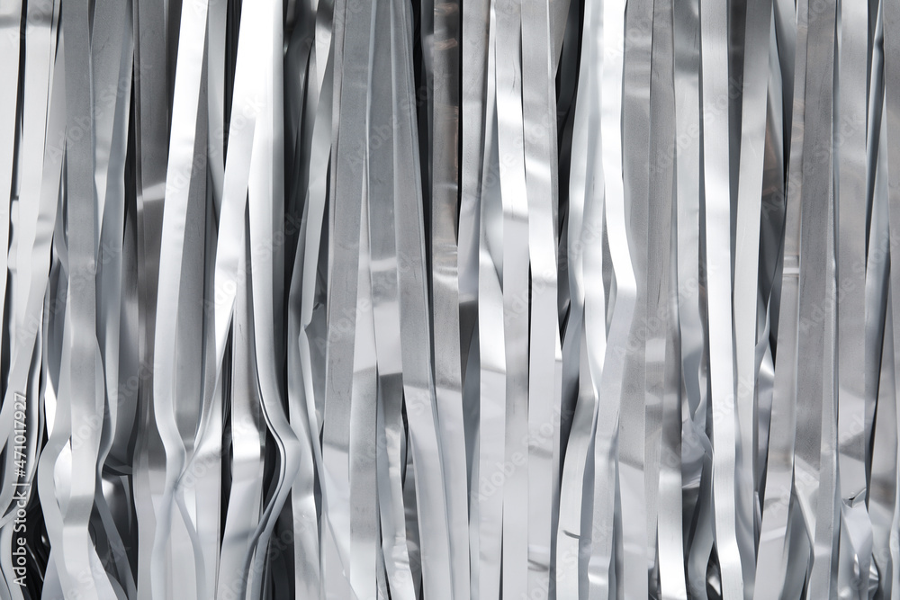 Shiny silver tinsel as background, top view