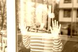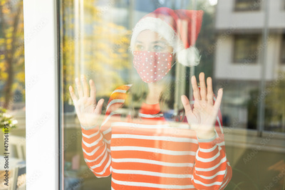 Young woman wearing a Santa hat and a protective face mask looking through a window
