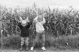 children in corn field having fun, making horns