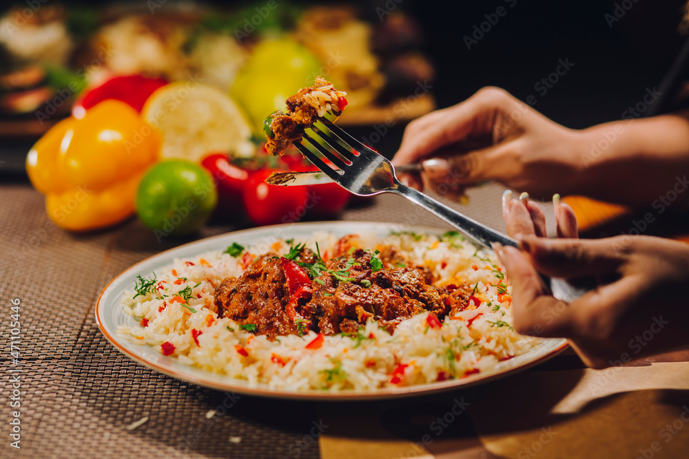 Rice food in plate with fresh vegetable ingredients behind and woman's hands holding fork with meat