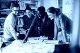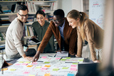 Happy black businessman and his coworkers analyzing mind map during meeting at casual office.