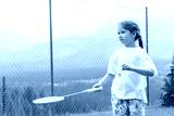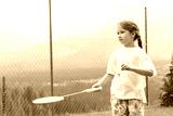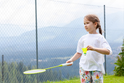 Young sporty active elementary school age girl playing badminton, holding a racket and a shuttlecock ready to serve. Outdoors portrait, closeup, background copy space, one person. Sport and recreation
