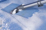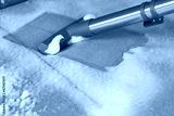 from the blue fabric of a dirty sofa, the washing vacuum cleaner collects thick foam