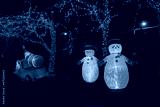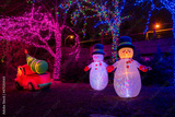 A pair of Christmas inflatable snowmen stand by as Santa drives a Christmas tree away in his truck.