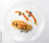 Dish of Spaghetti with oysters, cherry tomatoes and wild fennel