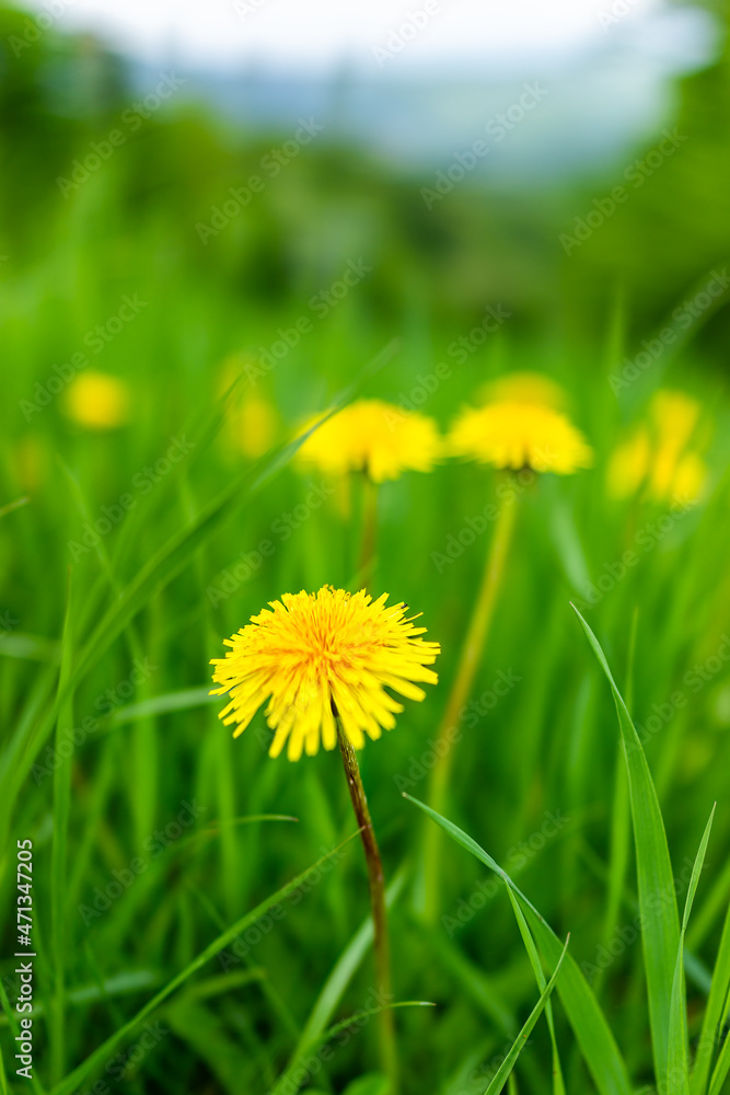Closeup macro of yellow dandelion wild flowers blooming texture detail in green lush grass in Sugar Mountain hiking in Blue Ridge Appalachian mountains