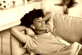 Relaxed black teenager in earphones listening to music or audio book, lying on couch at home