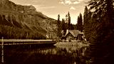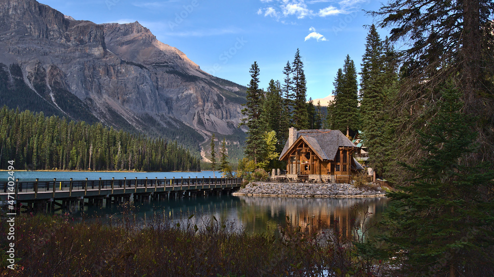 Beautiful view of Emerald Lake in Yoho National Park, British Columbia, Canada in the afternoon light with wooden lodge building and bridge in autumn.