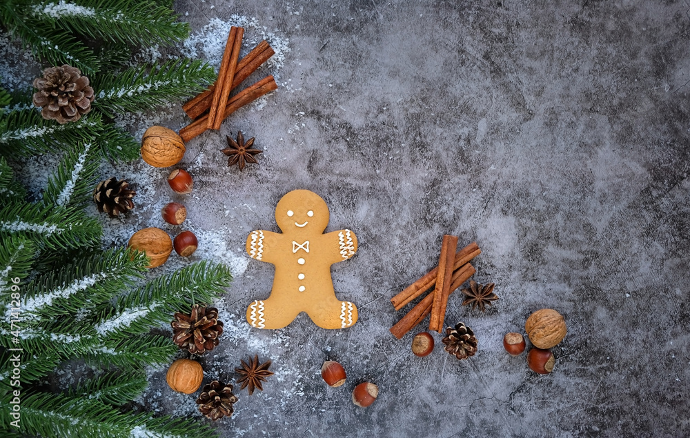 gingerbread man cookies, christmas natural decor of nuts, cinnamon, cones, fir on abstract grey background. New year and Christmas holidays concept. festive winter season. flat lay