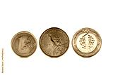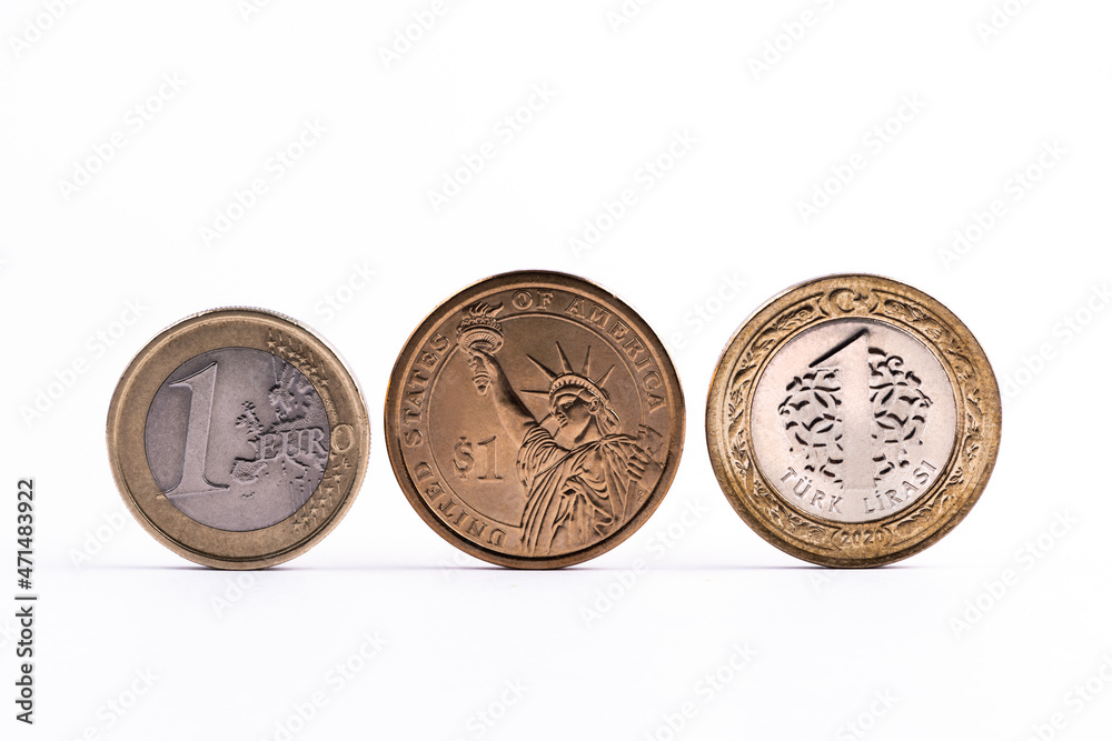 Coins in denominations of 1 Turkish lira, 1 euro and 1 US dollar on a white background