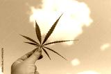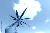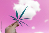Woman holds marijuana leaf in her hand against pink sky with clouds. Concept of dependence, distorted perception of reality