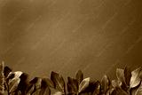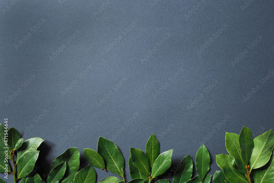 Frame of green laurel on a grey background with copy space for your text. Green laurel twigs for eco cookery concept