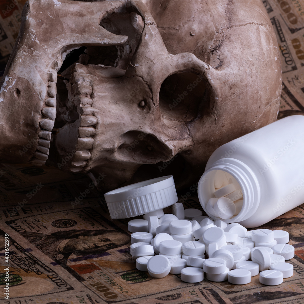 Human Skull and Pills on the Background of 100 American Dollar Bills