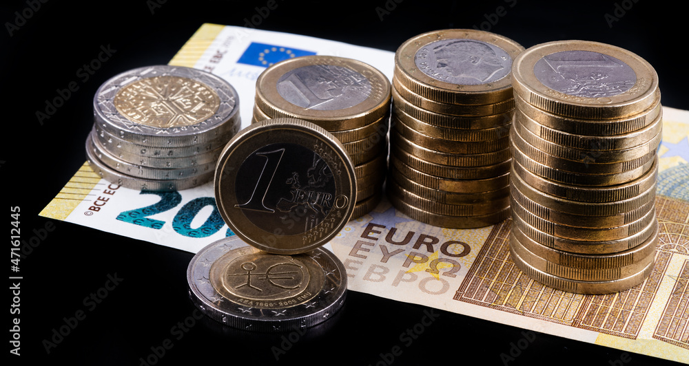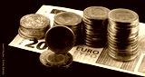 Coins in denominations of 1 and 2 euros against the background of a banknote of 200 euros