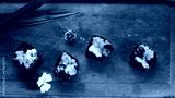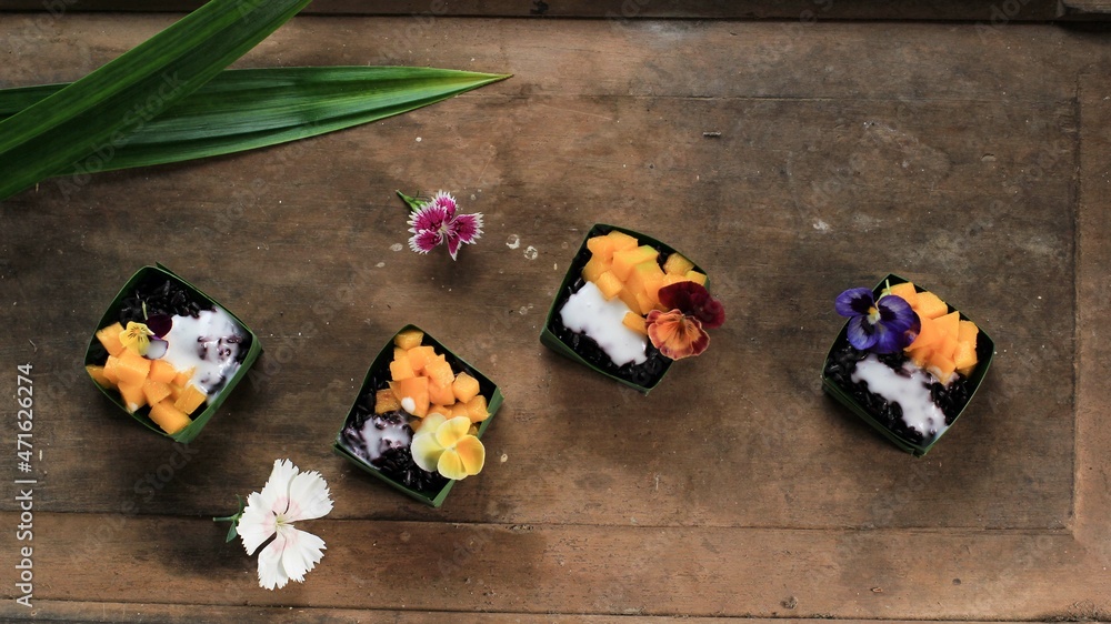 Homemade Coconut Black Sticky Rice with Mango in Pandan Leaves Cup, Selective Focus with Pansies Edibel Flower Topping