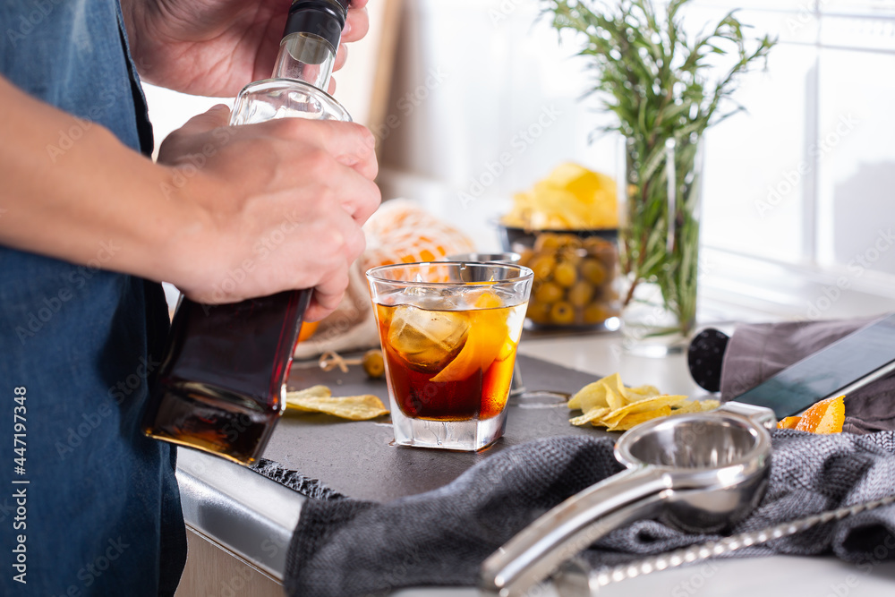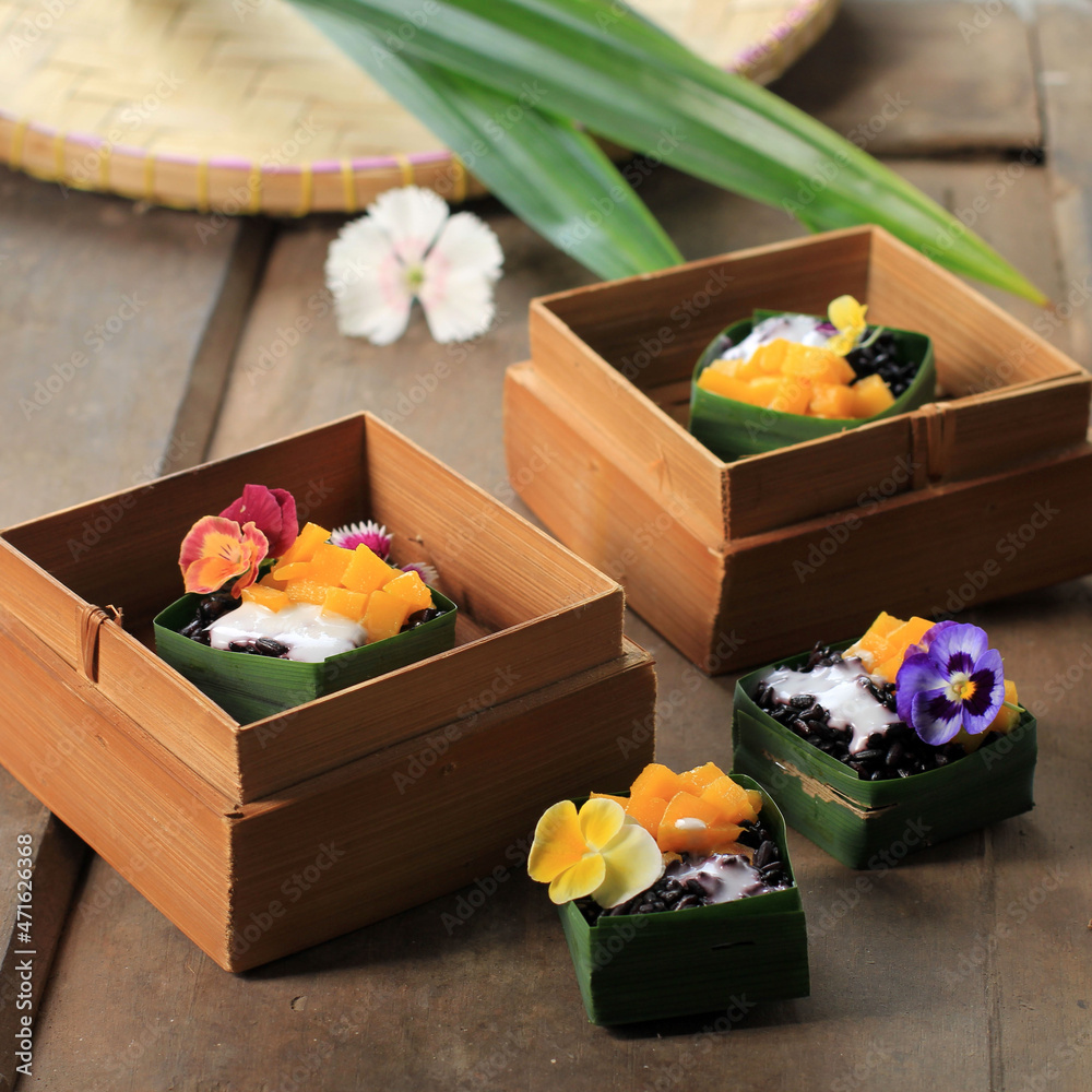 Homemade Coconut Black Sticky Rice with Mango in Pandan Leaves Cup, Selective Focus with Pansies Edibel Flower Topping