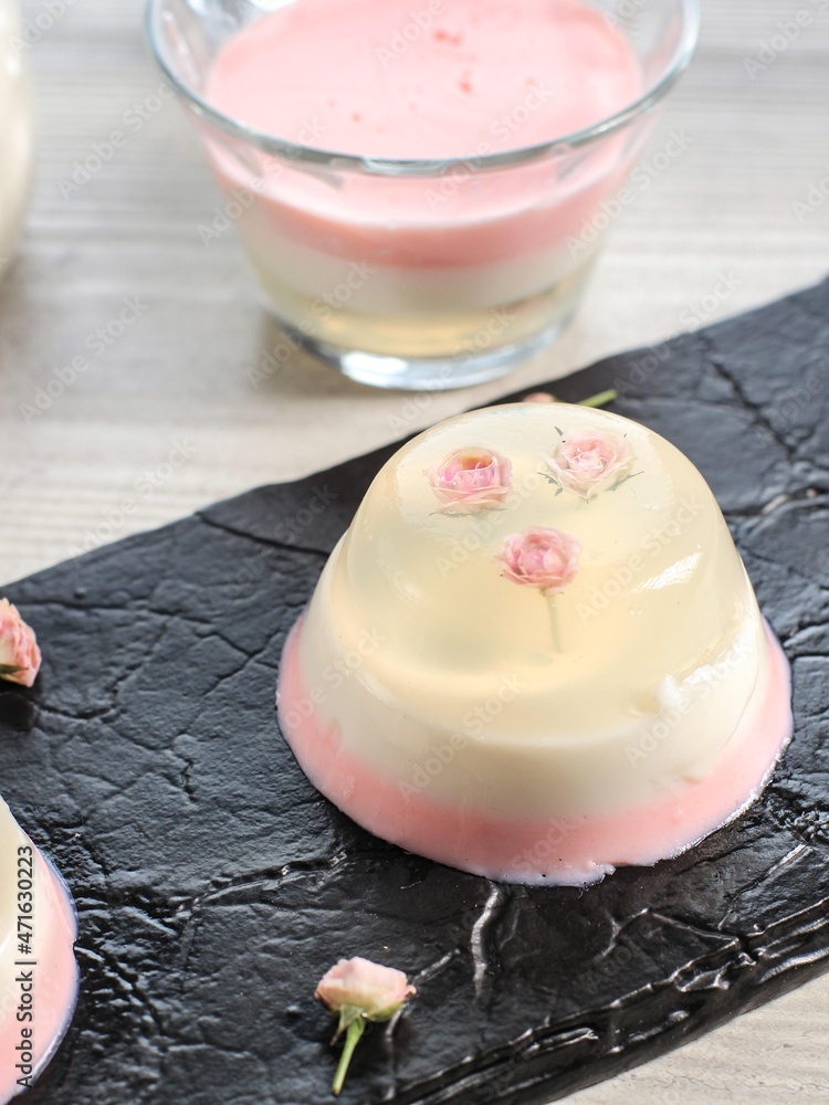 Clear Rose Pink Pudding in a Cup, One Various of Edible Flower Pudding Decoration