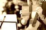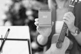 Musician holds calendar for 2022 and guitar against background of New Year tree