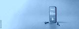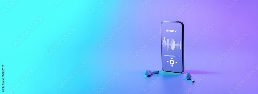 Music audio equipment. Audio beats, sound headphones, music application on mobile smartphone screen. Recording sound voice on neon gradient background. Live online radio player mockup banner.