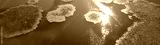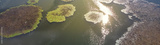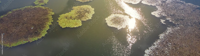 Panoramic top view lilly pad beds, submerged plants, cyanobacteria and moss algae blanket on surface of polluted pond in Dallas, Texas, USA
