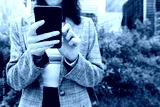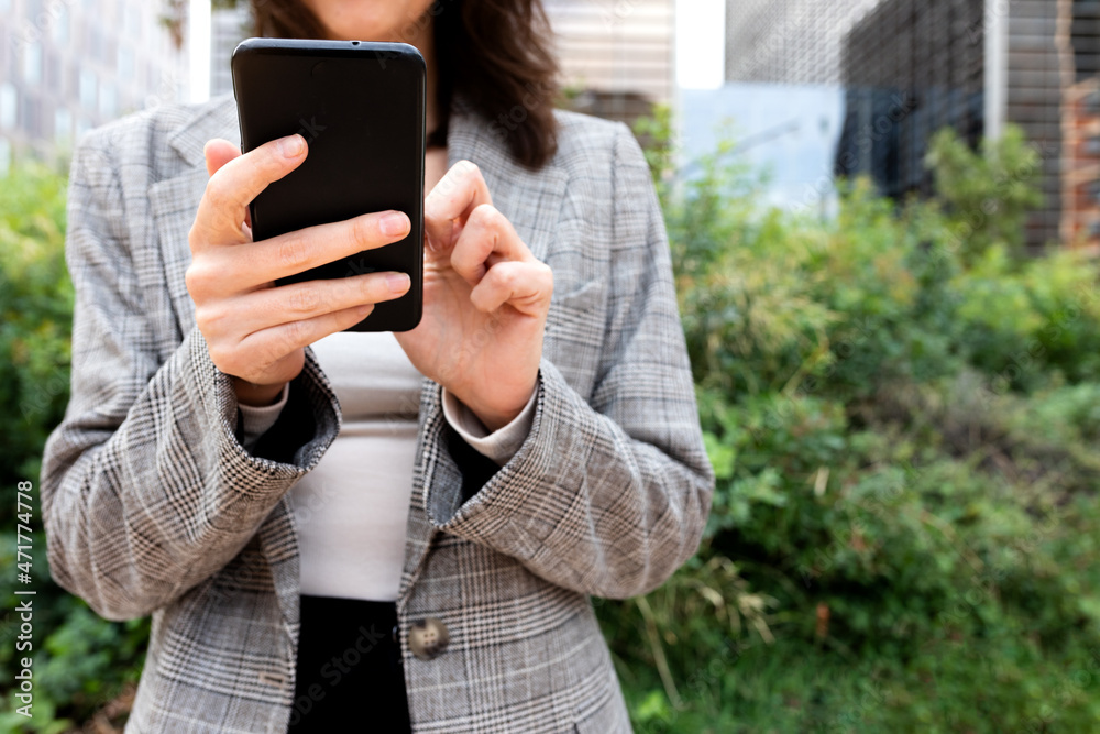 Unrecognizable business woman using mobile phone near office buildings. Selective focus on hands and phone. Copy space.