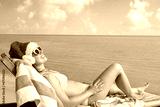 beautiful young woman in santa hat and sunglasses relaxing on sun lounger
