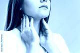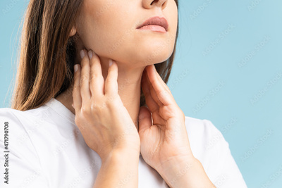 Woman with throat ache. Woman touching her throat