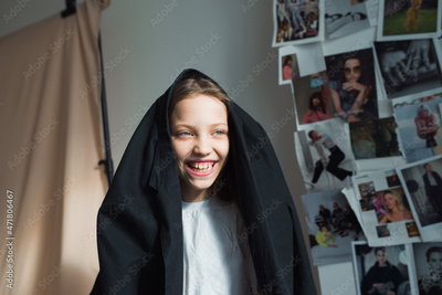young girl model wearing black oversize jacket laughting at studio