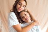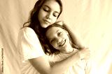 sisters hugging on beige color textile background