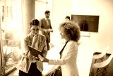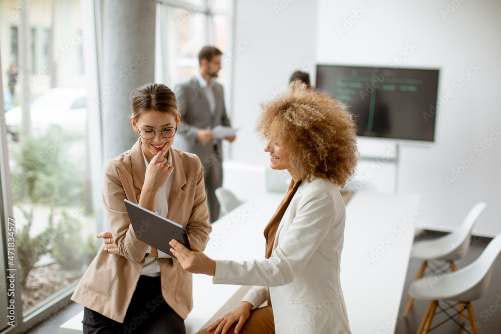 Young businesswomen discussing with digital tablet in the office with young people works behind them