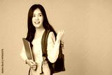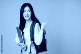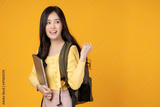 Happy young university student girl holding laptop computer with smile face carrying backpack Pretty asian woman stand over yellow background and look at copy space Happy Beauty female get surprised