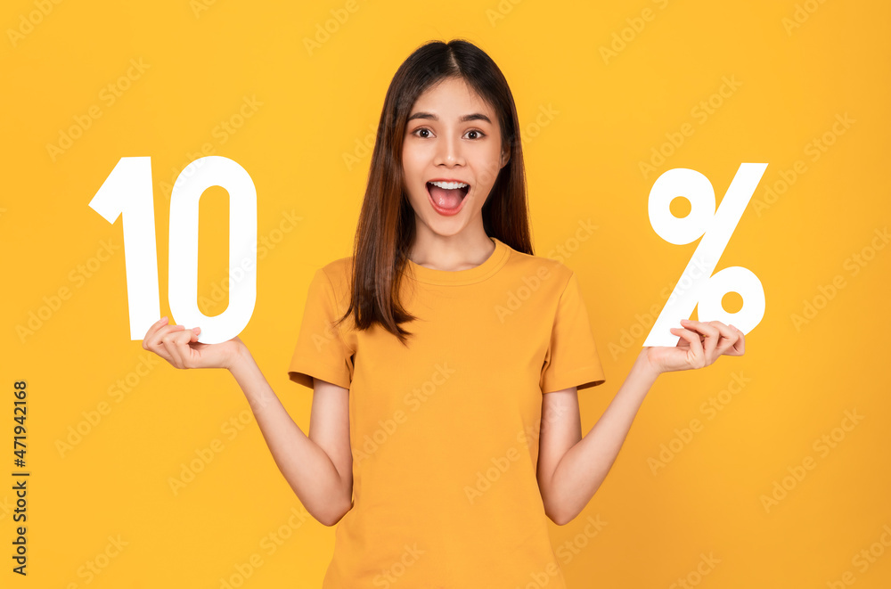 Cheerful beautiful Asian woman stand with hand holding 10% on light yellow background.
