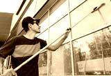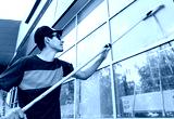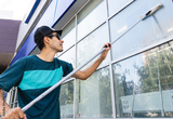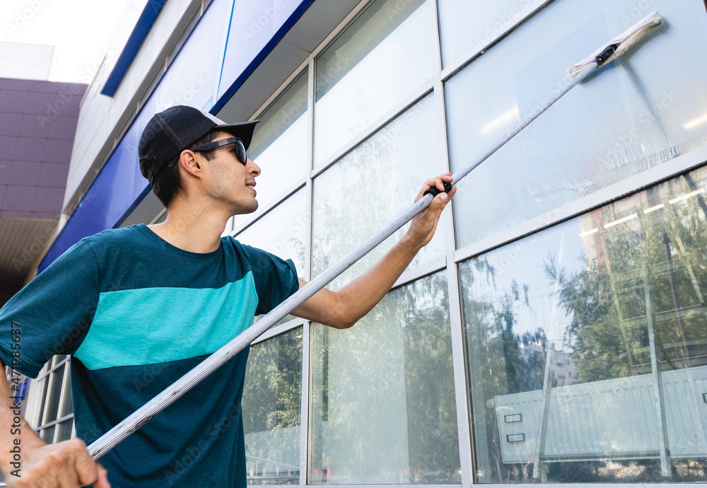 An employee of a professional cleaning service in overalls washes the glass of the windows of the facade of the building. Showcase cleaning for shops and businesses