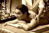 wellness, beauty and relaxation concept - beautiful young woman lying and having back massage at spa over candles and garland lights on window sill background
