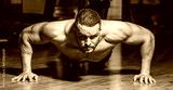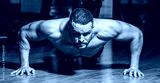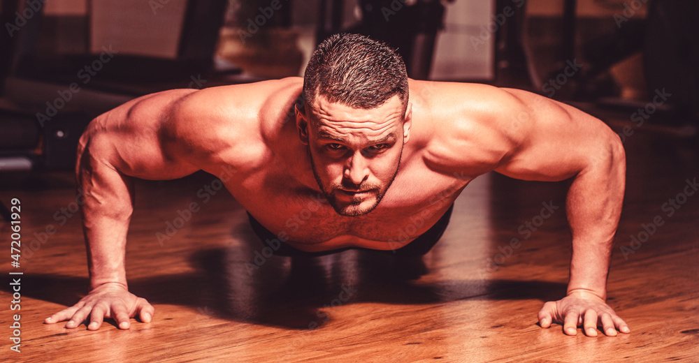 Muscular man doing push-ups on one hand against gym background. Sport. Muscular and strong guy exercising. Muscular male doing push-ups. Slim man doing some push ups a the gym. Man doing push-ups