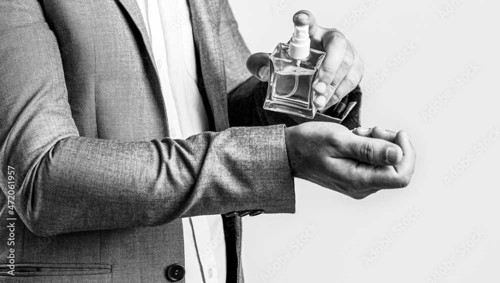 Fragrance smell. Men perfumes. Fashion cologne bottle. Man holding up bottle of perfume. Men perfume in the hand on suit background. Man in formal suit, bottle of perfume, closeup