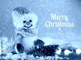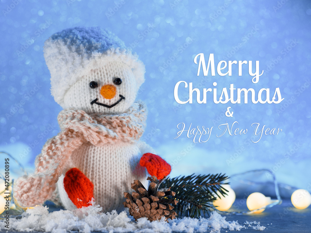 Knitted snowman in a hat, scarf and mittens. Merry christmas Greeting Card