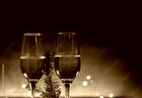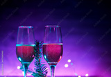 Two glasses of sparkling wine or champagne, neon Christmas background. Christmas Tree branch, copy space