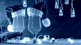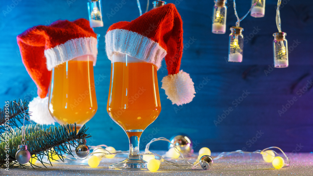 Two glasses of Christmas beer ale in Santa hats on the festive table. Blue wooden background, garland and branches of the Christmas tree. Copy space