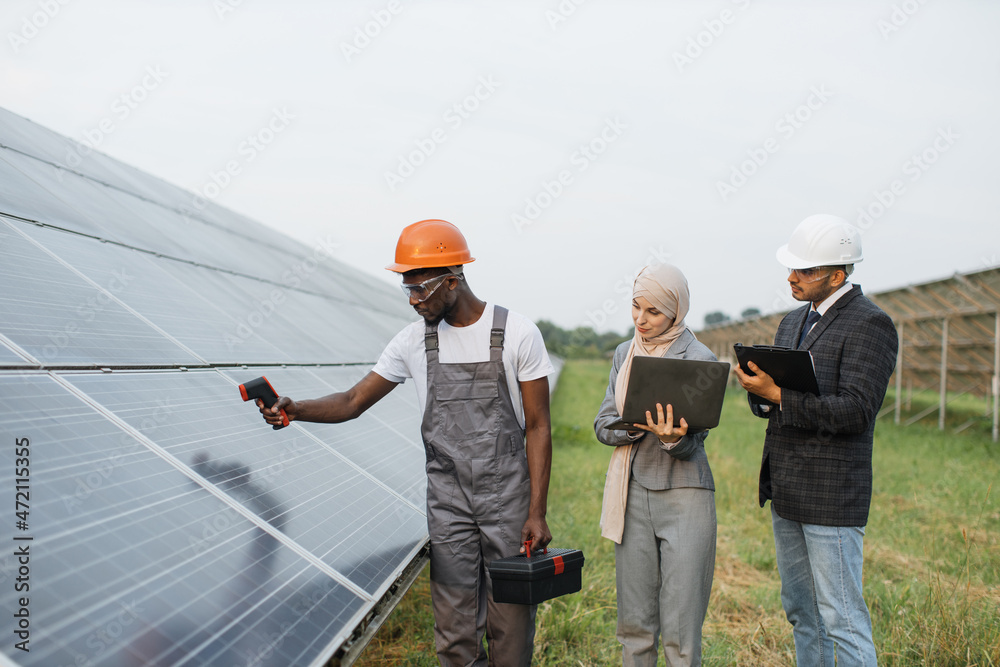 African american technician showing temperature of solar panels on thermal imager to muslim woman in hijab and indian man in white helmet. Maintenance of modern equipment.