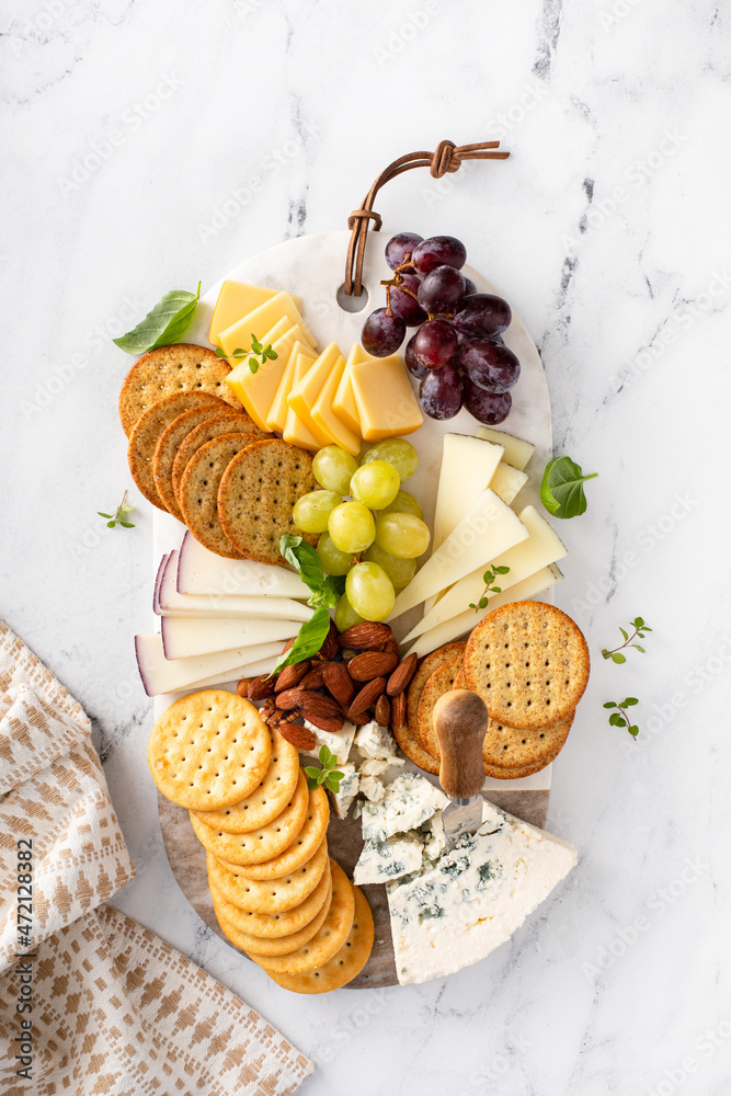 Cheese board with crackers, nuts and grapes