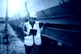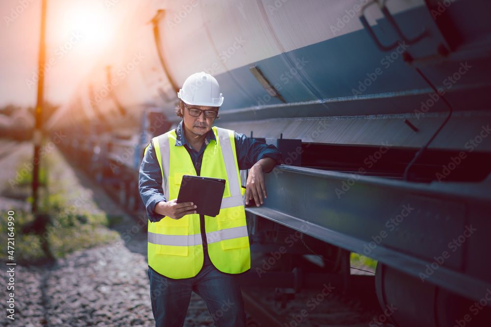 Engineer under inspection and checking construction process railway switch and checking work on railroad station .Engineer wearing safety uniform and safety helmet in work.