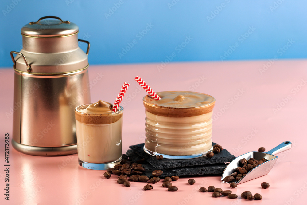 Dalgona Coffee, Popular Foaming Coffee from South Korean. on Pink Background